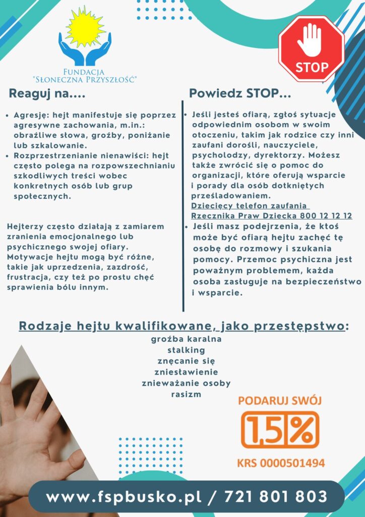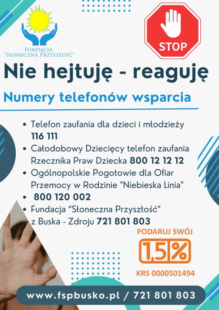 Nasza Fundacja we współpracy z Psychologiem oraz Policją organizują duży projekt pn: „Nie hejtuję- reaguję”.